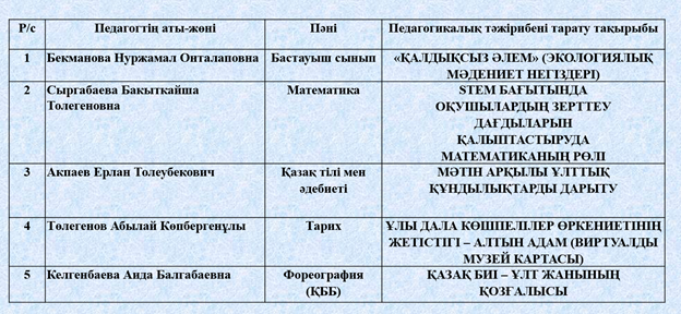 Вебинарда өз тәжірибесімен бөліскен педагогтер: бастауыш сынып мұғалімі Бекманова Нуржамал Онталаповна «Қалдықсыз әлем» (экологиялық мәдениет негіздері)», математика пәні мұғалімі Сыргабаева Бакыткайша Толегеновна «STEM бағытында оқушылардың зерттеу дағдыларын қалыптастыруда математиканың рөлі», қазақ тілі мен әдебиеті пәні мұғалімі Акпаев Ерлан Толеубекович «Мәтін арқылы ұлттық құндылықтарды дарыту», тарих пәні мұғалімі Төлегенов Абылай Көпбергенұлы «Ұлы дала көшпелілер өркениетінің жетістігі – алтын адам (виртуалды музей картасы)», қосымша білім беру педагогі (хореография) Келгенбаева Аида Балгабаевна «Қазақ биі – ұлт жанының қозғалысы» тақырыбында өздерінің авторлық бағдарламаларымен педагогтерді таныстырды.