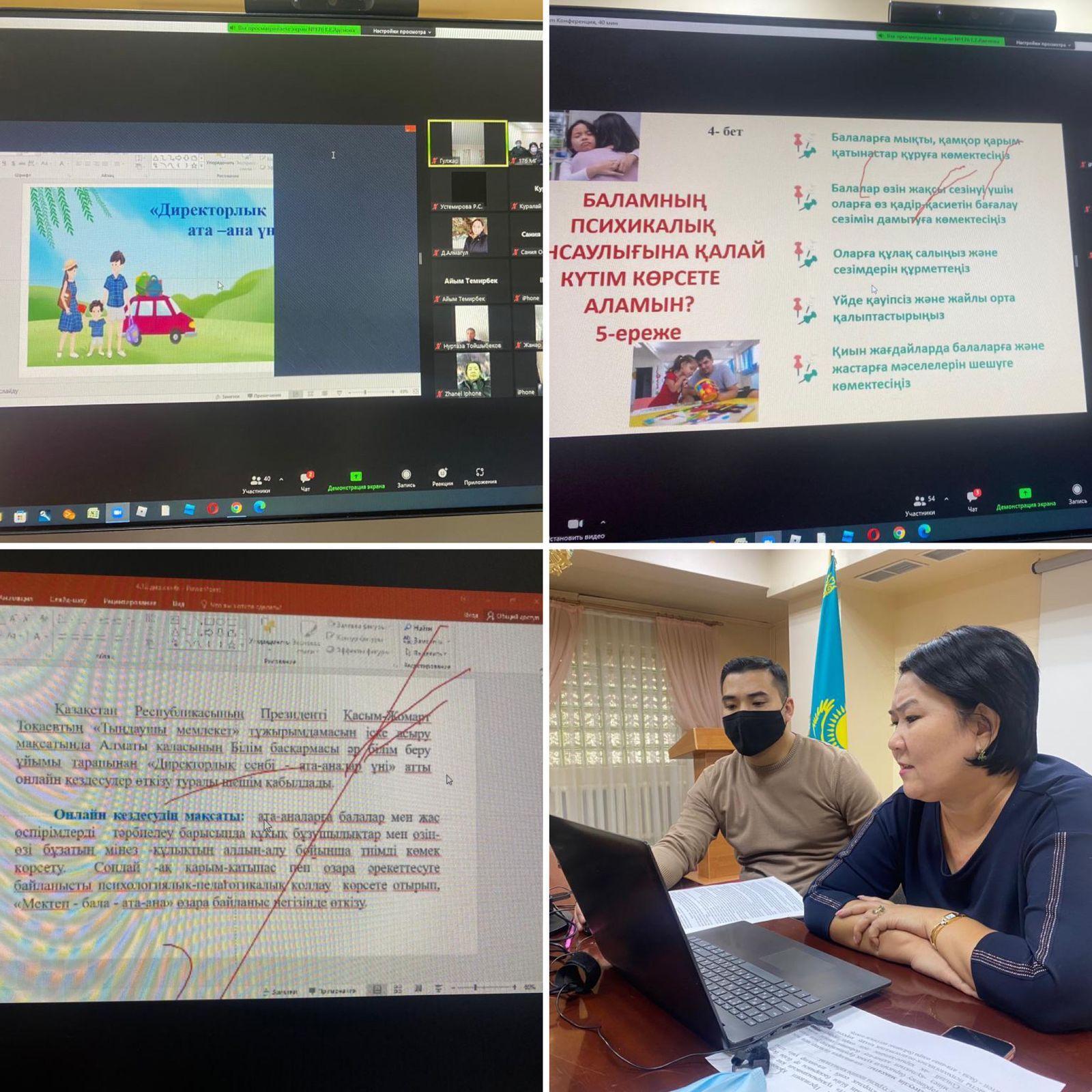 Алматы қаласы Наурызбай ауданы №176 мектеп-гиназиясында 2021 жылдың 4 желтоқсан күні «Директорлық сенбі - ата-ана үні» тақырыбында 9-сыныптың ата-аналарымен ZOOM платформасында онлайн кездесу өткізілді.