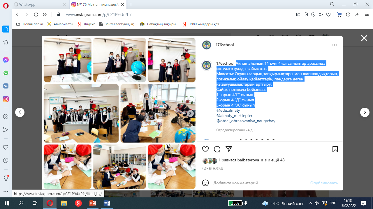 Ақпан айының 11 күні 4-ші сыныптар арасында интеллектуалды сайыс өтті.