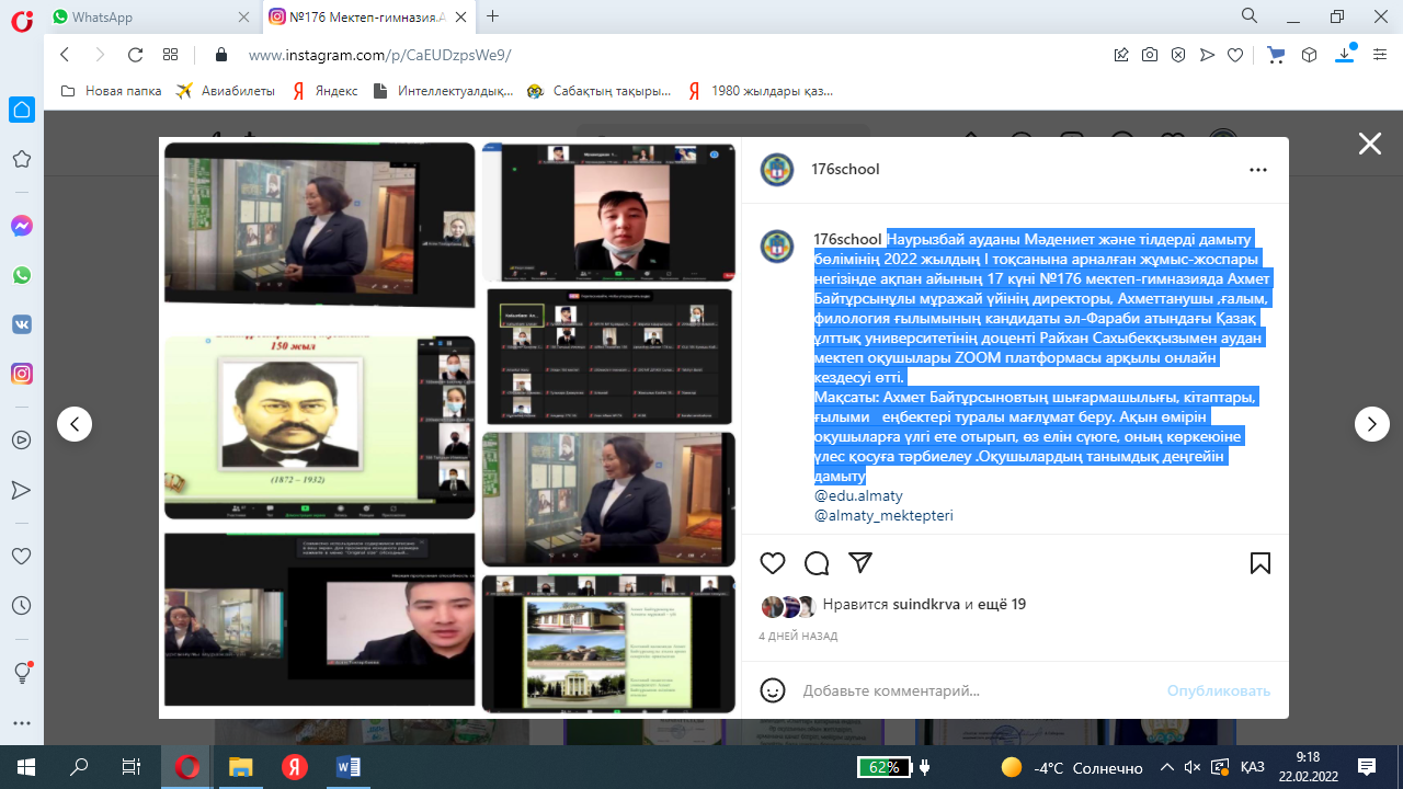 Наурызбай ауданы Мәдениет және тілдерді дамыту бөлімінің 2022 жылдың І тоқсанына арналған жұмыс-жоспары негізінде ақпан айының 17 күні №176 мектеп-гимназияда Ахмет Байтұрсынұлы мұражай үйінің директоры, Ахметтанушы ,ғалым, филология ғылымының кандидаты әл-Фараби атындағы Қазақ ұлттық университетінің доценті Райхан Сахыбекқызымен аудан мектеп оқушылары ZOOM платформасы арқылы онлайн кездесуі өтті.