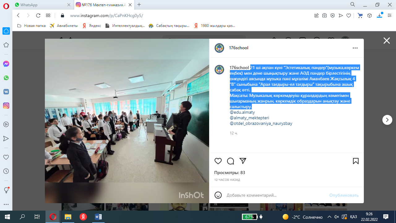 21 ші ақпан күні “Эстетикалық пәндер”(музыка,көркем еңбек) мен дене шыңықтыру және АӘД пәндер бірлестігінің онкүндігі аясында музыка пәні мұғалімі Аманбаев Жақсылық 4 “В” сыныбына “Арал тағдыры-ел тағдыры” тақырыбына ашық сабақ өтті.