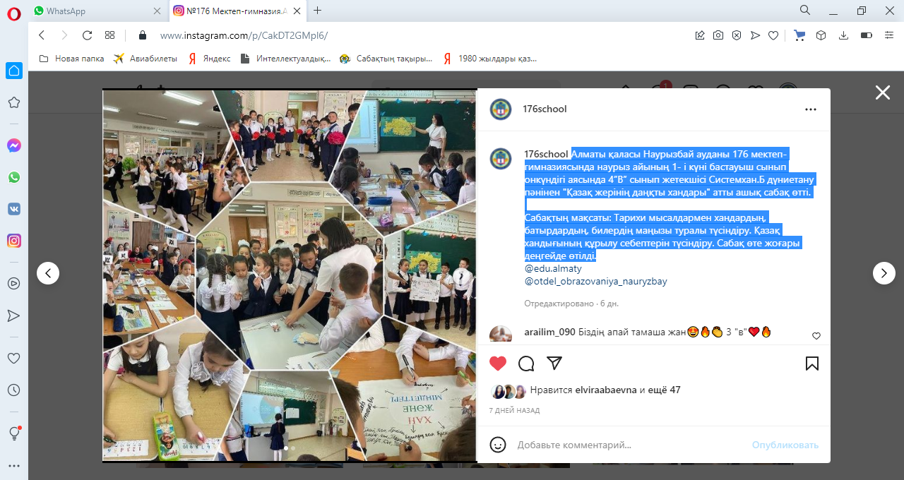 Алматы қаласы Наурызбай ауданы №176 мектеп-гимназиясында наурыз айының 1- і күні бастауыш сынып онкүндігі аясында 4”В” сынып жетекшісі Системхан.Б дүниетану пәнінен "Қазақ жерінің даңқты хандары" атты ашық сабақ өтті.