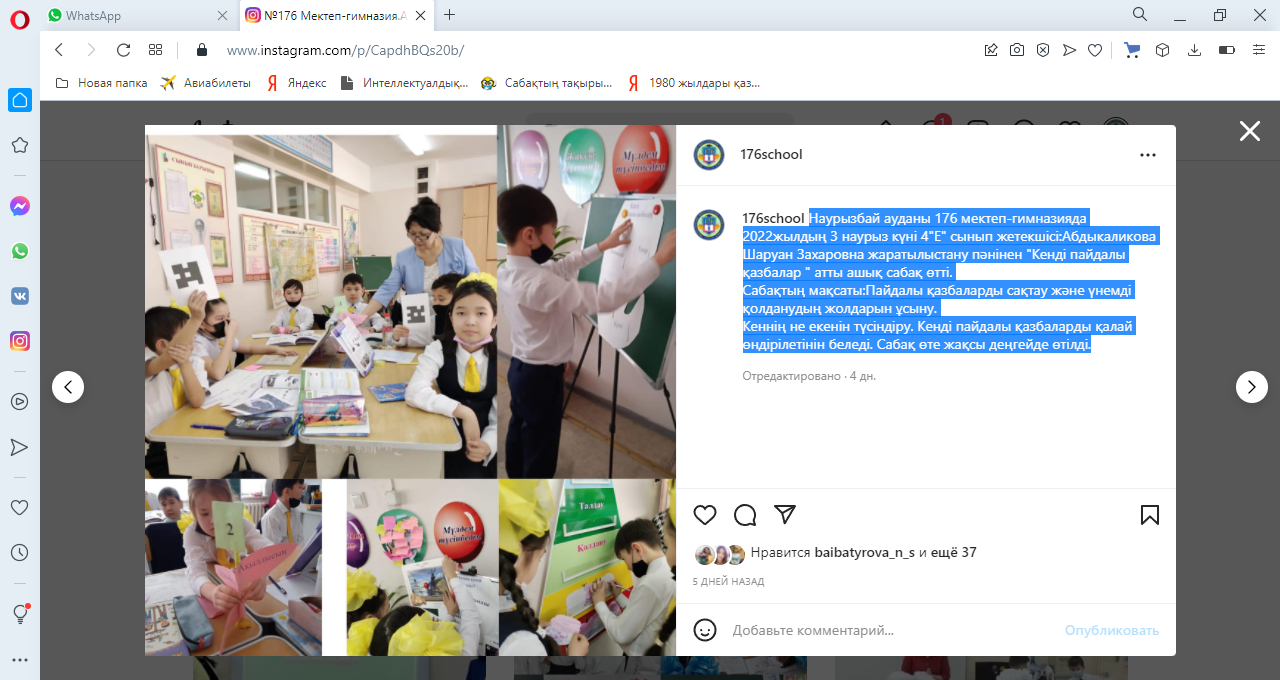 Наурызбай ауданы №176 мектеп-гимназияда 2022жылдың 3 наурыз күні 4"Е" сынып жетекшісі:Абдыкаликова Шаруан Захаровна жаратылыстану пәнінен "Кенді пайдалы қазбалар " атты ашық сабақ өтті.