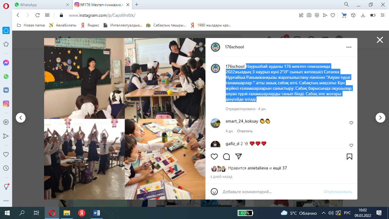 Наурызбай ауданы №176 мектеп-гимназияда 2022жылдың 3 наурыз күні 2"Ә" сынып жетекшісі Сатаева Нұрғайша Рахымжанқызы жаратылыстану пәнінен "Алуан түрлі ғаламшарлар " атты ашық сабақ өтті. Сабақтың мақсаты: Күн жүйесі ғаламшарларын салыстыру. Сабақ барысында оқушылар алуан түрлі ғаламшарларды танып білді. Сабақ өте жоғары деңгейде өтілді.
