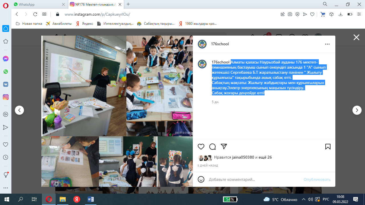 Алматы қаласы Наурызбай ауданы 176 мектеп-гимназияның бастауыш сынып онкүндігі аясында 1 "А" сынып жетекшісі Сергебаева Б.Т жаратылыстану пәнінен " Жылыту құрылғысы" тақырыбында ашық сабақ өтті.
