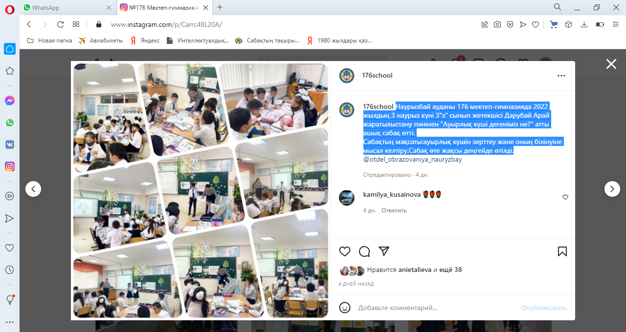Наурызбай ауданы 176 мектеп-гимназияда 2022 жылдың 9 наурыз күні 3"з" сынып жетекшісі Дарубай Арай жаратылыстану пәнінен "Ауырлық күші дегеніміз не?" атты ашық сабақ өтті.