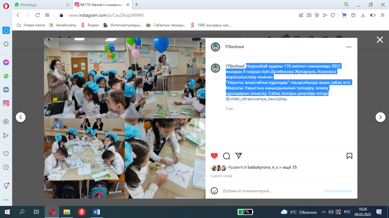 Наурызбай ауданы №176 мектеп-гимназияда 2022 жылдың 11 наурыз күні Дусебекова Жупаркуль Асановна жаратылыстану пәнінен