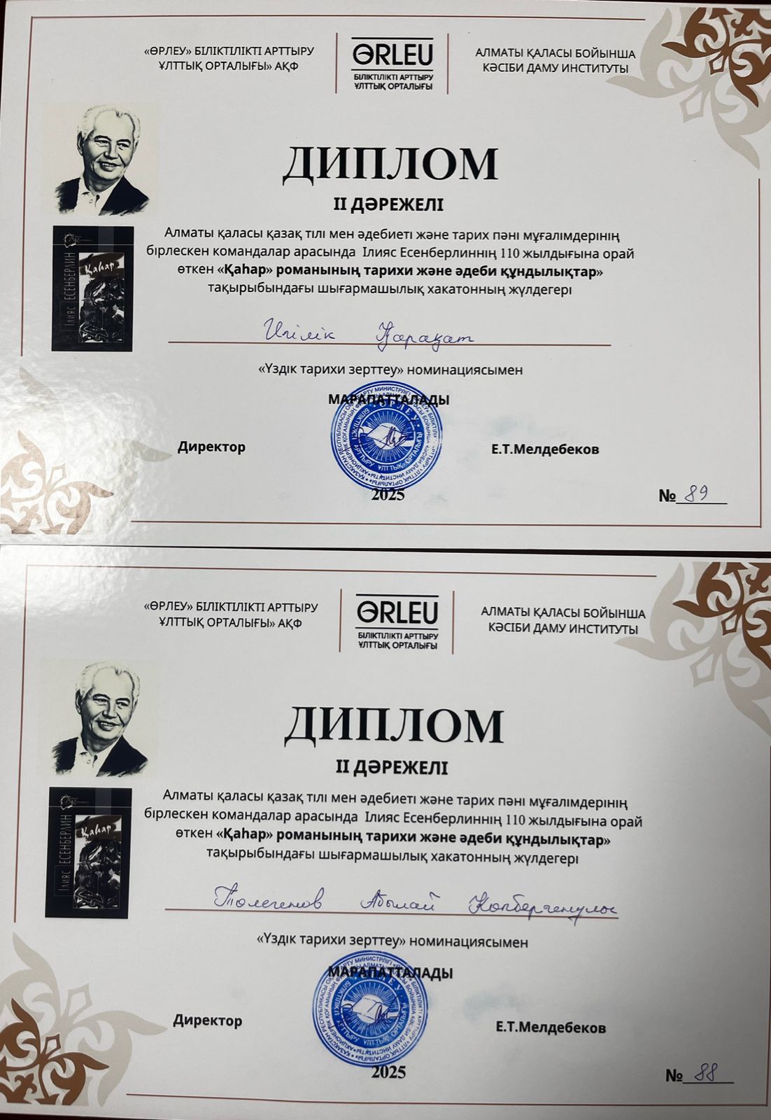 Алматы қаласы қазақ тілі мен әдебиеті мұғалімдерінің бірлескен командалары арасында Ілияс Есенберлиннің 110 жылдығына орай өткен “Қаһар” романындағы тарихи және әдеби құндылықтар” тақырыбындағы шығармашылық хакатонға қатысқан №176 мектеп-гимназияның тарих пәні мұғалімі, директордың оқу ісі жөніндегі орынбасары Төлегенов Абылай Көпбергенұлы және қазақ тілі мен әдебиеті пәні мұғалімі Игілік Қарақат жүлделі ІІ ОРЫН иеленді! Құттықтаймыз!