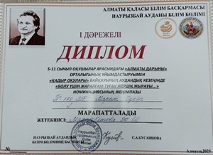 “Алматы дарыны” орталығының ұйымдастыруымен өткен “Қадыр оқулары” байқауының аудандық кезеңінде вокал номинациясы бойынша 1-орын иеленіп, қалалық кезеңге жолдама алған 176 мектеп-гимназиясының 9 “Е” сынып оқушысы Марат Іңкәр