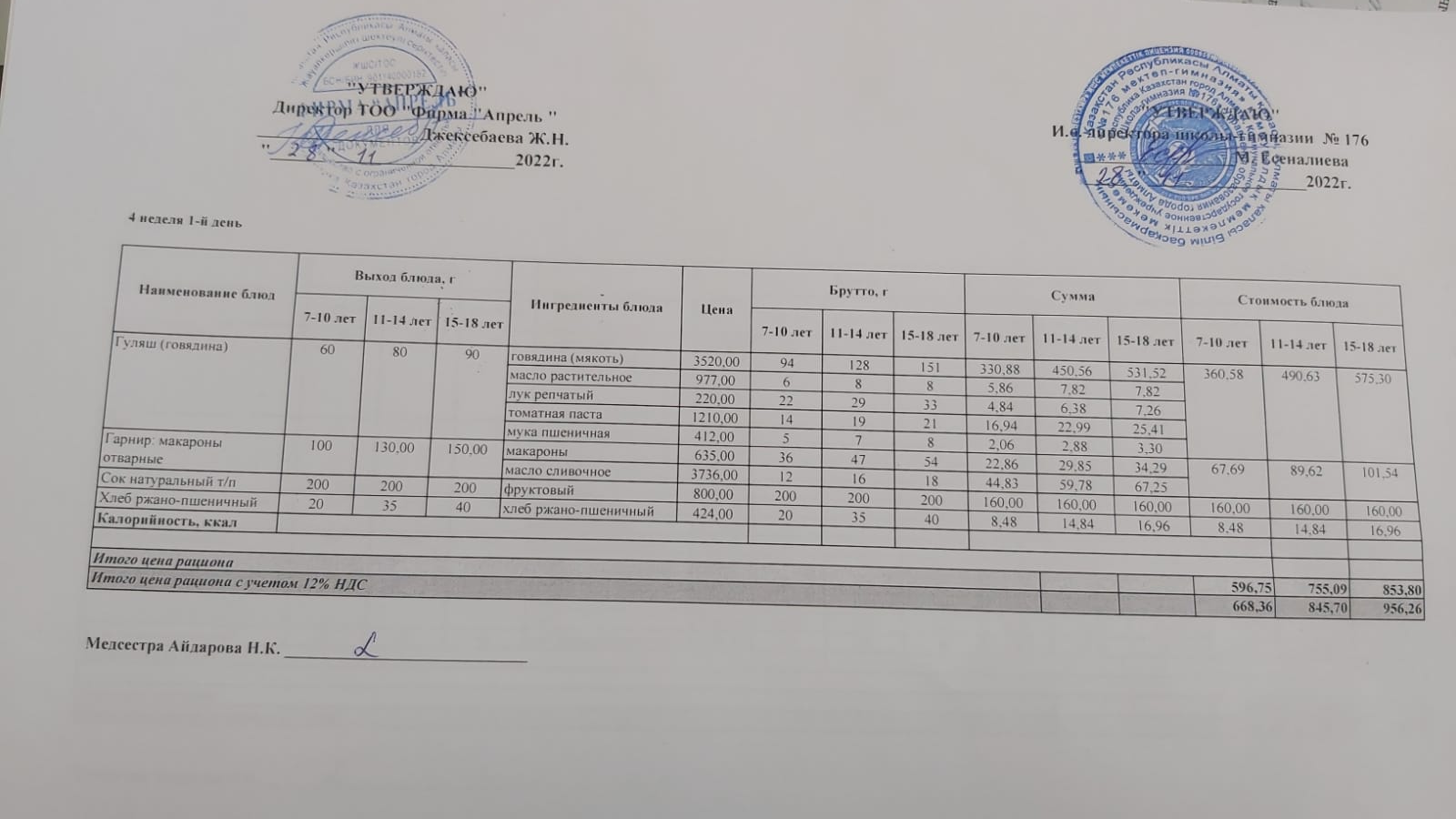 2022-2023 оқу жылындағы №176 мектеп - гимназиясының қараша айындағы оқушылардың ыстық тамақпен қамтылуына АКТ